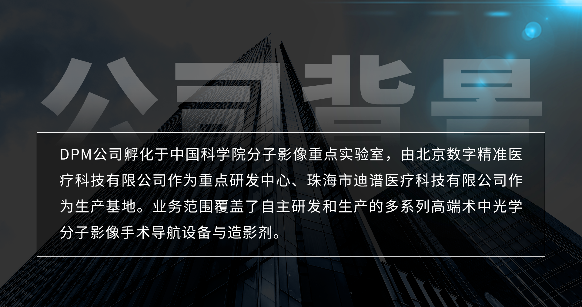 DPM公司孵化于自動(dòng)化所,由北京數(shù)字精準(zhǔn)醫(yī)療科技有限公司作為重點(diǎn)研發(fā)中心、珠海市迪譜醫(yī)療科技有限公司作為生產(chǎn)基地。業(yè)務(wù)范圍覆蓋了自主研發(fā)和生產(chǎn)的多系列高端術(shù)中光學(xué)分子影像手術(shù)導(dǎo)航設(shè)備與造影劑。